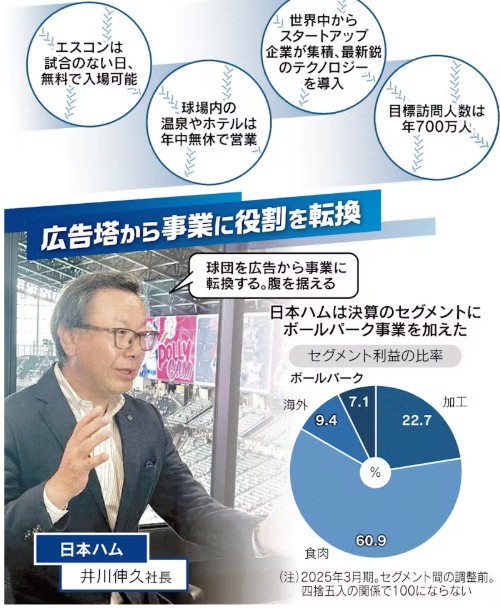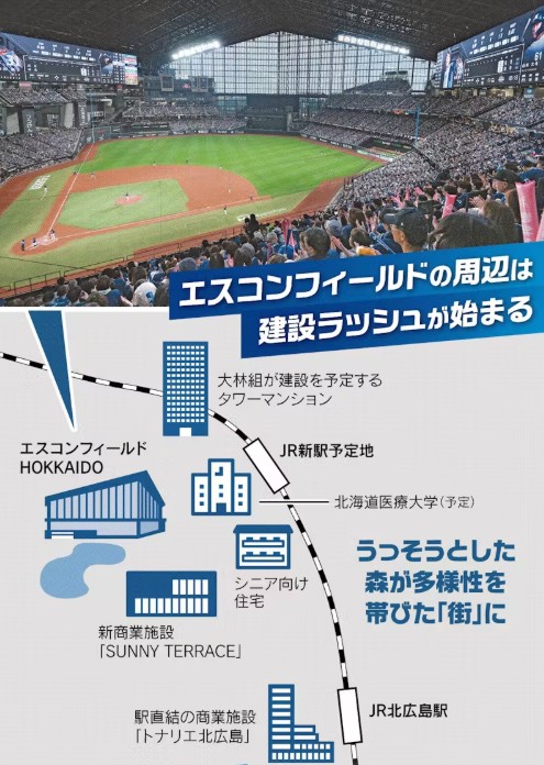 北海道日本ハムファイターズが野球界の常識を超える球団作りに挑んでいる。親会社の広告塔としての役割を脱し、本業の食品に並ぶビジネスへ。そして今挑むのが先端テクノロジーと共生する街づくりだ。なぜ日本ハムは未来都市を築くのか。改革者たちの挑戦と苦悩に迫る。JR北広島駅を降り、赤とんぼが飛び交う山道を越えると巨大なガラスウオールが特徴的なスタジアムが目に入る。日本ハムの本拠地「エスコンフィールドHOKKAIDO」(北海道北広島市)だ。周辺では3月にホテルがオープンしたのに続き、6月には商業施設が開業した。と日経記事にあります。