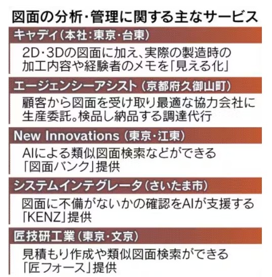 ものづくりに欠かせない図面の分析を得意とする中小の企業と製造業が連携し、サプライチェーン(供給網)を強化する動きが増えている。図面を深く読むとノウハウの共有が進み、複数の工場で同じ仕事をこなしたり、めったに作らない一品物をすぐ調達できたりする。図面は製造業の最重要データとの調査もあり、活用の巧拙が競争力を左右する。と日経記事にあります。