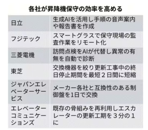 日立製作所は米エヌビディアの生成AI(人工知能)をエレベーターの保守検査に活用する。AIが手順を音声案内するほか、カメラで撮影した映像から報告書を自動作成できるようにして作業に必要な人員を半分にする。エレベーターの保守台数は過去20年で3割強増える一方、定年退職などで熟練作業員は減っている。デジタル技術の導入は待ったなしだ。と日経記事にあります。