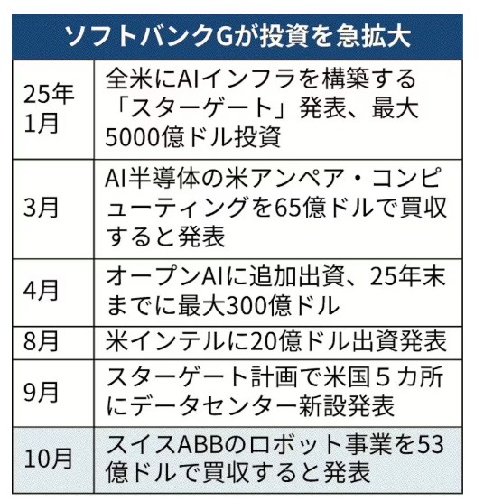 SBGの孫正義会長兼社長は同買収について「次のフロンティアは(ロボや自動運転などの)『フィジカルAI』だ」と語った。その上で「(人知を超える)人工超知能(ASI)とロボティクスを融合させることで人類の未来を切り開く画期的な進化を実現していく」と強調した。ABBは世界の産業ロボ市場で2~3位のシェアを持つ。工場内の状況を仮想空間に再現する「デジタルツイン」の活用で先行する。「ロボット大手の中でもデータ活用に積極的」(国内同業)とされ、こうしたデジタル技術との相乗効果をSBGは取り込む。データセンター、半導体に続いて手を打ったのがロボットだった。1月の取締役会で、グループが持つロボット関係の出資先を集約する中間持ち株会社「ロボホールディングス(HD)」の設立を決めた。
