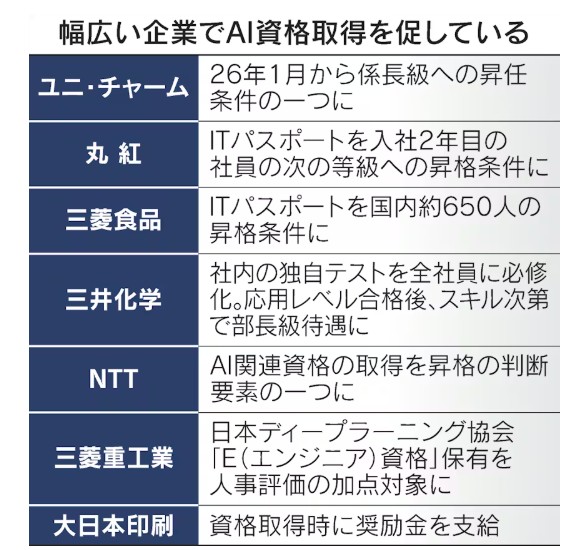 ユニ・チャームは2026年1月から人工知能(AI)関連資格の取得を係長級への昇進要件に加える。AI活用能力を高めて業務の生産性を高めるためで、丸紅や三菱食品も若手に資格取得を義務付ける。日本は海外よりAI学習の意欲が低く、国際競争力の低下が懸念される。企業主導でAIスキルを底上げする動きが広がってきた。と日経記事にあります。