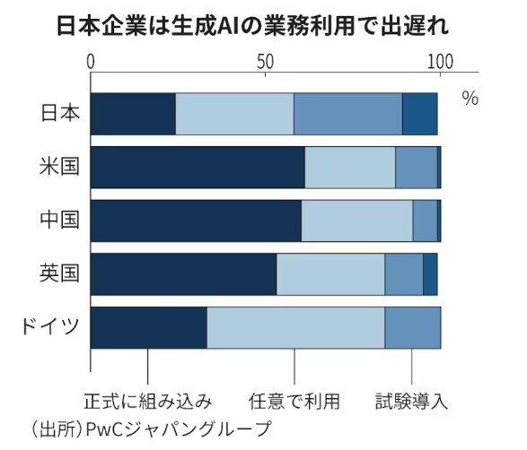 日本生産性本部によると、23年の日本の1人当たりの労働生産性は経済協力開発機構(OECD)加盟の38カ国中、32位と低迷する。AIスキルは生産性向上に欠かせないが、PwCジャパングループによると、生成AIを業務プロセスの一部に組み込む企業は米国が61%、中国が60%の一方で、日本は24%にとどまっている。27年度からG検定の取得を課長級の管理職の昇進要件にする三菱商事のように、海外勢との競争にさらされる日本企業を中心に危機感は強い。米国では余剰人員のリストラの背景にAI普及があるとの見方もある。米雇用調査会社チャレンジャー・グレイ・アンド・クリスマスによると、米国企業では25年、AI導入を含む技術革新で2万人超の人員削減が見込まれる。リストラが容易ではない日本では従業員のAIスキルを向上させて業務の生産性を高めようとする意識が強い。