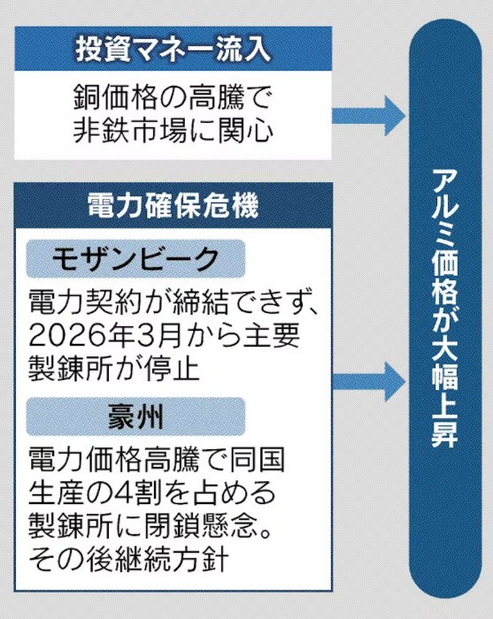 丸紅が25年12月にまとめた相場見通しによればアルミ価格は28年には1トン3200ドルまで上がると想定する。同社軽金属部地金課の赤坂英佑課長は「米国での電力調達競争をみてもアルミ製錬業を取り巻く環境は厳しくなりつつある」とし「将来的にアルミ製錬所の新設どころか維持すら難しくなりそうだ」と話す。あらゆる産業に欠かせないアルミだが、AIブームの波に押され、電力はデータセンターへと向かう。銅の価格高騰で代替材としてのアルミへの需要が強いところに供給懸念が強まれば、価格上昇のスパイラルにつながりうる。