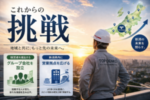 これまでトップ電工は、一つひとつの仕事を積み重ねながら、少しずつ会社の形をつくってきました。 その中で、これから挑戦していきたいことがいくつかあります。 一つは、グループ会社を設立し、経営者を輩出していくことです。 現場 […]